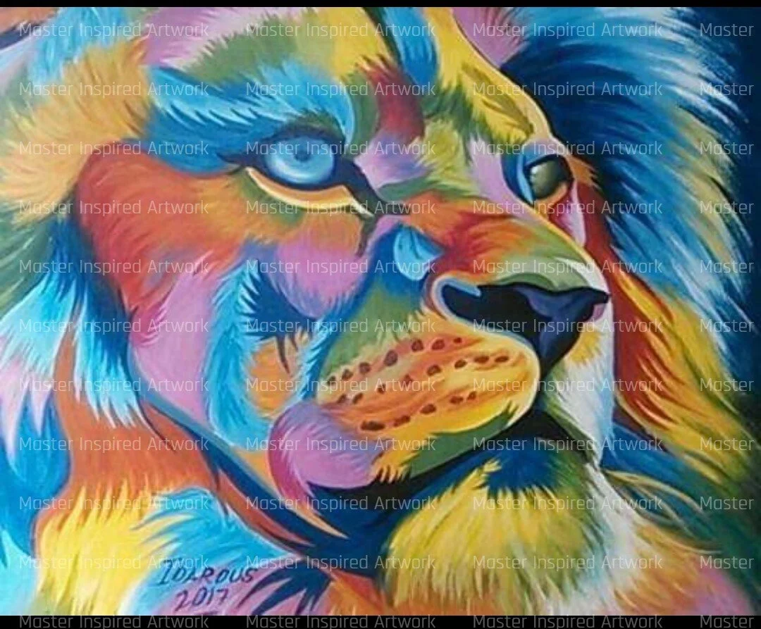 This painting feature a lion's head rendered with bright, contrasting colours, strong lines creating a modern and visually striking piece, which would be impactful and striking on any wall.